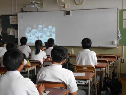 写真は、「ゲゲゲの鬼太郎」の映像を見て、イメージを膨らませている場面です。