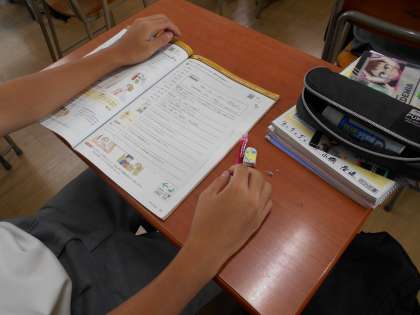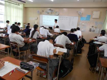 写真は、生徒たちがいろいろな例文をもとに、英作に取り組んでいる様子です。