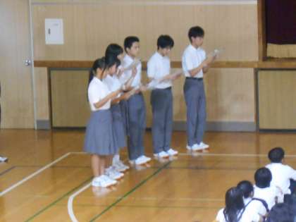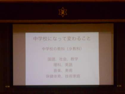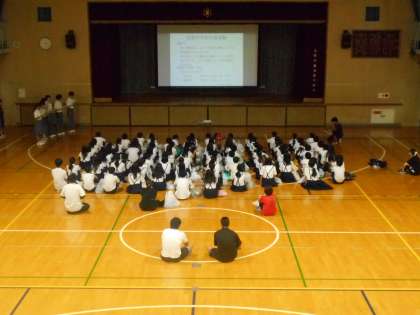 授業終了後、体育館に集合し、生徒会の先輩たちから中学校生活についての説明を受けました。