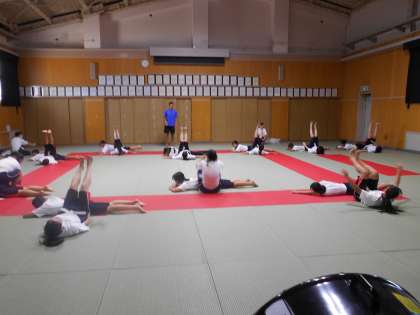 女子は、格技室で柔道の受け身練習を行い、安全に配慮しつつ基本的な動作を身につけていました。