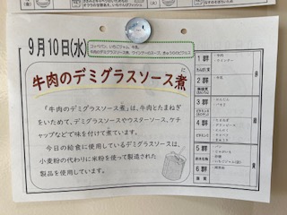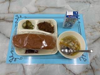 【牛肉のデミグラスソース煮 ウィンナースープ きゅうりのピクルス コッペパン ジャム 牛乳】