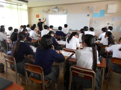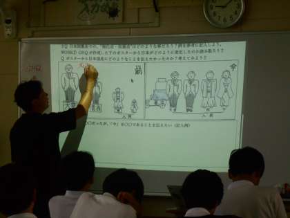 GHQが作成したポスターと現在のポスターを見比べて、その違いから何が読み取れるかを考え話し合う授業でした、こうした比較を通して、生徒たちは歴史的な社会構造の変遷や現代の多様性についてより深く考える機会となりました。
