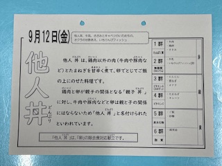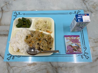 【他人丼 ささみとキャベツのいためもの オクラの甘酢あえ 芋けんぴフィッシュ 牛乳】