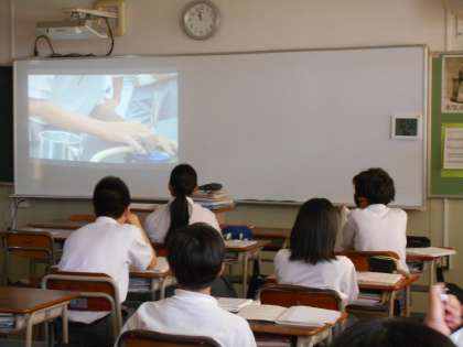 写真は、テストの様子をビデオ撮影したものを全員で見直しながら、安全な使い方や操作の改善点を確認し、スキルアップにつなげている場面です。