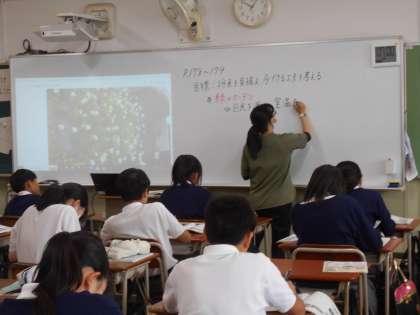 目標は「将来を見据え、今できる工夫を考える」です。生徒たちは、活発に意見を出し合いながら、自分自身の行動を振り返り、持続可能な社会に向けてできることを真剣に考えていました。