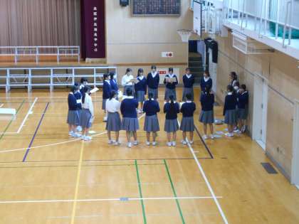 3年生は体育館で全体合唱の練習に取り組みました。写真は、各パートに分かれて音を確認し合っている様子です。