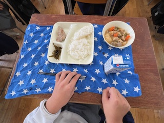 【豚肉の梅風味焼き ふきよせ煮 米飯 牛乳