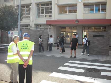 今日も朝早くから、地域の方々やPTA役員の皆さまが生徒たちを見守ってく入れています。