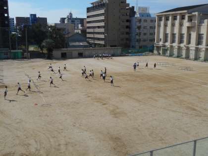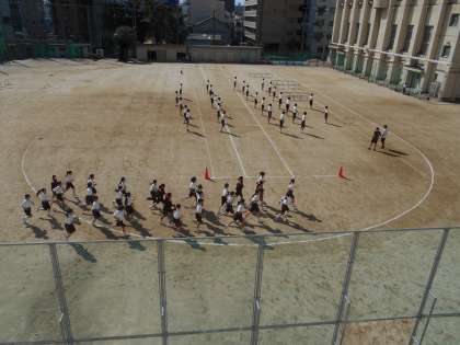 生徒たちは、晴天下の運動場でハードル練習や50m走などに取り組んでいました。