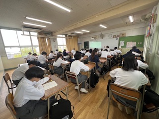前回の授業で学習した内容の復習として、小テストを行いました。写真はそのときの様子です。生徒たちは集中して問題に取り組み、これまでの学びをしっかりと確認していました。