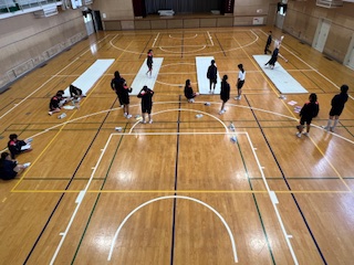 前回り・後回りなどの回転系の技に取り組むグループと、倒立系の技を練習するグループに分かれ、各自のレベルに合わせて練習を進めました。