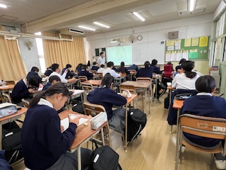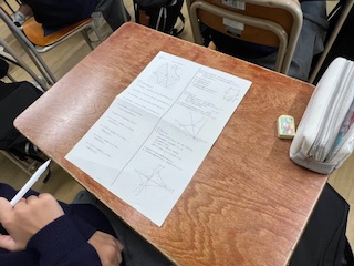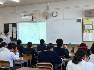 今日の授業☆1年生数学科11月11日 公開日 2025/11/11 更新日 2025/11/11 お知らせ 反比例と比例のグラフが交わってできる三角形の面積を求める問題に挑戦しました。 生徒たちは、グラフの交点を正しく読み取り、その座標から三角形の高さや底辺の長さを求めるなど、複数の数学的視点を組み合わせながら解き進めていました。 難問にも意欲的に取り組む生徒の姿が見られました。 いいね(0)