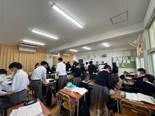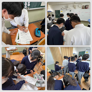 写真は、身近なものを例にしながら、仲間と英語を使って「どちらが〜か」を言い合う活動に取り組んでいる様子です。