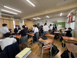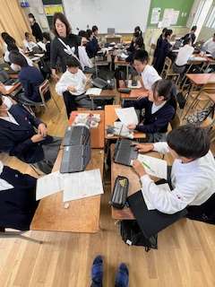今日の授業☆1年生英語科11月12日 公開日 2025/11/12 更新日 2025/11/12 お知らせ 「My Hero」をテーマに、自分の憧れの人物について紹介する活動を行いました。 写真は、生徒たちが自分のヒーローについて英語で伝え合い、友達の話を興味深く聞いている様子です。 身近な題材を通して、英語で表現する楽しさやコミュニケーションの力を伸ばしています。 いいね(0)