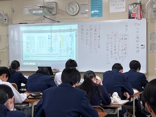 今日の授業☆3年生国語科11月12日 公開日 2025/11/12 更新日 2025/11/12 お知らせ 「フロン規制」に関する文章を通して、環境問題への理解を深めました。 筆者の主張や文章の構成を読み取りながら、地球環境を守るために私たちができることについて考えていました。 いいね(0)