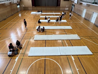 女子は体育館でマット運動を行い、タブレット端末を使って自分の動きを振り返りながら、仲間と「より良い技のポイント」について話し合いながら取り組んでいました。