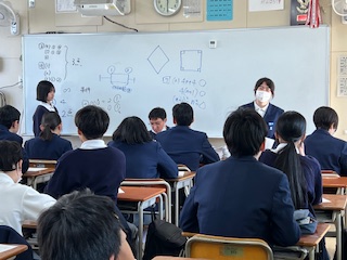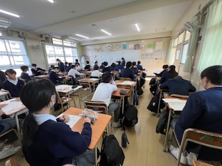 写真は、名前を呼ばれた生徒が立って返却を受けている様子です。