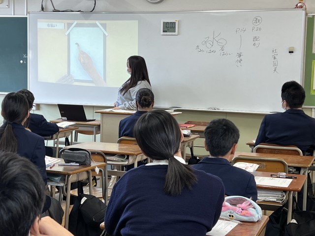 写真は、動画を活用しながら「右払い」の筆の運びや力の入れ方を確認している様子です。