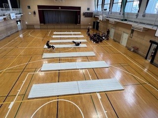 女子は体育館でマット運動の試験に臨み、これまでの練習の成果を発揮しようと集中して取り組んでいました。