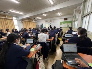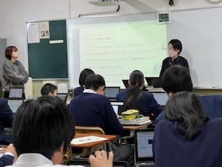 写真は、「My New Year Resolution」のカードを作成しながら、自分の目標を英語で表現している様子です。