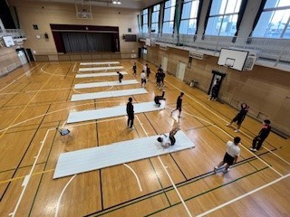 男子は、体育館でマット運動に取り組みました。基本的な動作を確認しながら、安全に配慮して練習を行っていました。