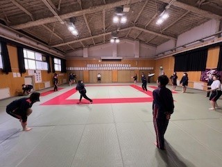 女子は、格技室でソフトフリスビーやソフトドッジボールを使い、俊敏性を養うトレーニングを行いました。