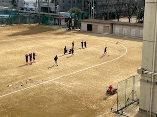 女子は運動場で、サッカーのドリブル練習に取り組みました。