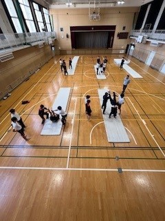 写真は、後転倒立に挑戦している場面で、まわりの仲間が補助に入りながら、互いに声をかけ合って練習している様子です。