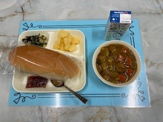 【ミートボールと野菜のカレー煮 ツナとほうれん草のソテー パインアップル コッペパン いちごジャム 牛乳】