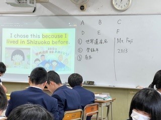 日本の世界遺産について班の仲間と調べ、その内容を英語で紹介する活動に取り組みました。