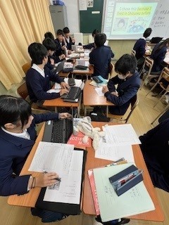 生徒たちは協力しながら調べ学習を進め、英語での表現を工夫して発表準備をしている様子です。