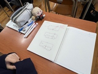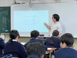 写真は、直列回路と並列回路における電流の流れ方とその大きさについて、問題プリントを用いて振り返っている様子です。