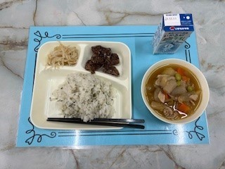【くじらのたつたあげ 豚肉とじゃがいもの煮もの もやしの甘酢あえ 菜飯 牛乳】