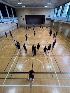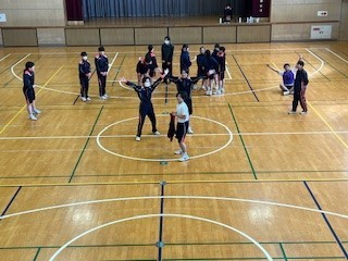 体育館での学級対抗ドッジボールゲームの様子です。