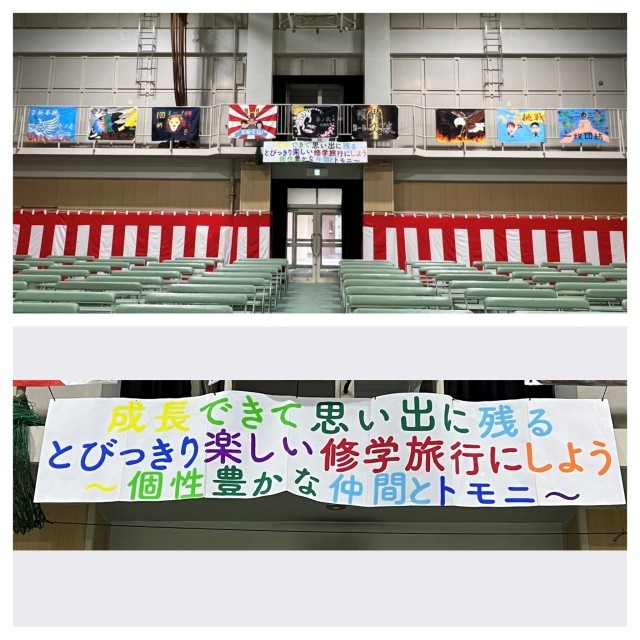 三年生では、修学旅行がありました。中学校で最も大きな行事の中で私達はたくさんの思い出を作りました。 一日目の民泊では普段は体験できないようなことをたくさん体験しました。泊まる前は「民泊先の人はどんな人なのだろう」と不安と期待がありましたが、民泊先の方々はとても優しく接してくださり、とても楽しい一日になりました。 二日目では、宮島を自由に散策しました。食べ歩きをしたり、厳島神社を散策したりと、宮島でしか味わうことのできない貴重な体験をすることができました。また、夜のレクリエーションではイントロクイズやダンスの披露、漫才で笑いの渦が巻き起こり、とても盛り上がった夜になりました。 三日目では、原爆ドームと広島平和記念資料館に行きました。戦争の悲惨さや、平和の意味を知る貴重な機会となりました。世界の平和と二度とこんな悲劇が起きないことを願って、千羽鶴を奉納しました。