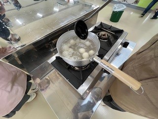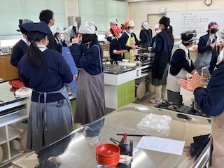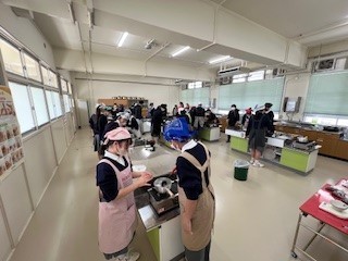 調理実習でぜんざい作りに取り組んでいる様子です。