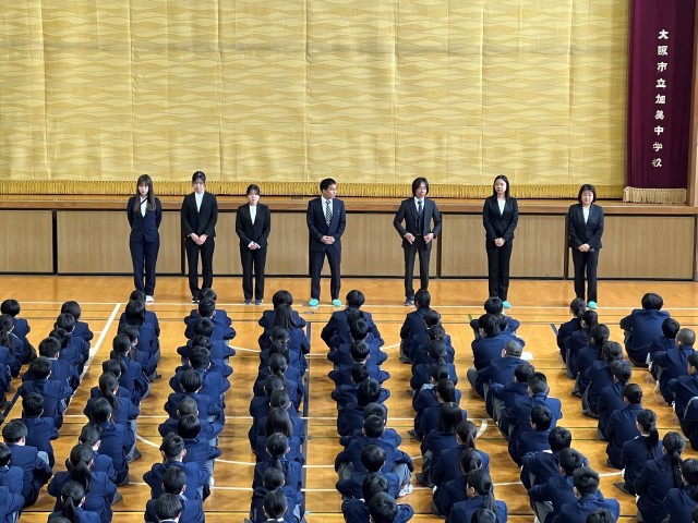 体育館にて、新しく本校に赴任された教職員の紹介、本校を去られた教職員の紹介がありました。