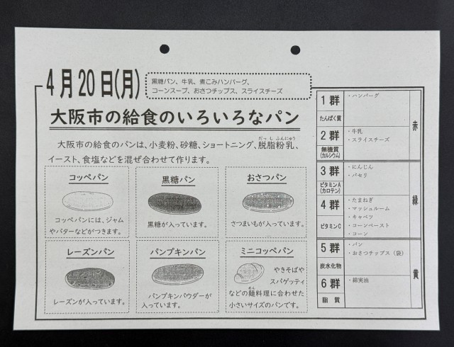 本日は、黒糖パン、牛乳、煮込みハンバーグ、コーンスープ、お札チップス、スライスチーズです。