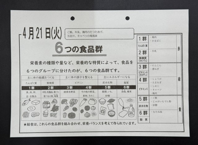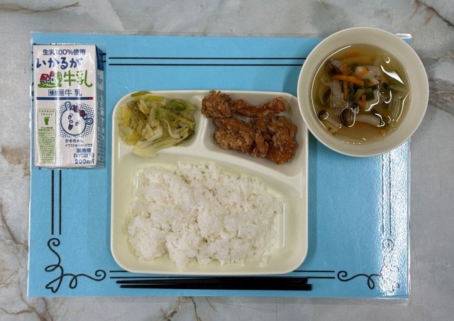 本日は、ご飯、牛乳、鶏肉のたつたあげ、五目汁、キャベツの梅風味です。