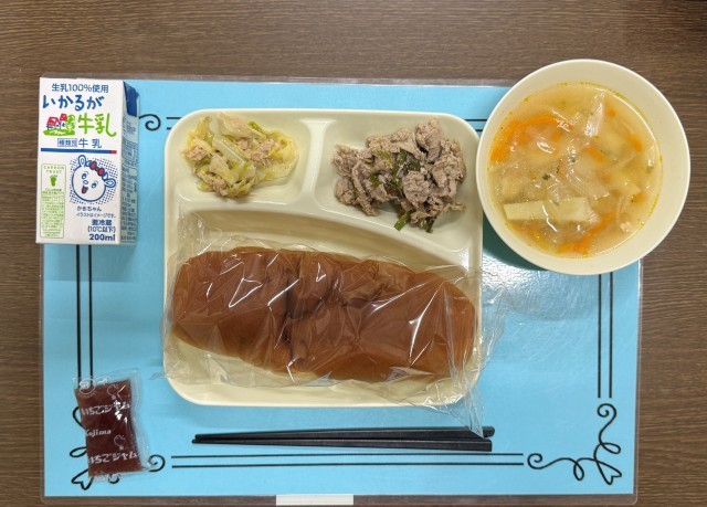 本日は、コッペパン、いちごジャム、牛乳、豚肉のガーリック焼き、スープ、ツナとキャベツのソテーです。子どもたちはどのメニューもおいしく食べていました。特に、豚肉のガーリック焼きが人気でたくさんお代わりしていました。