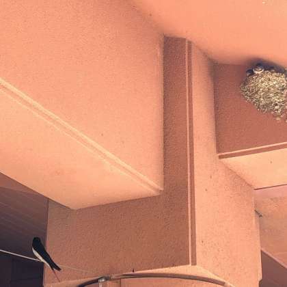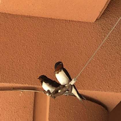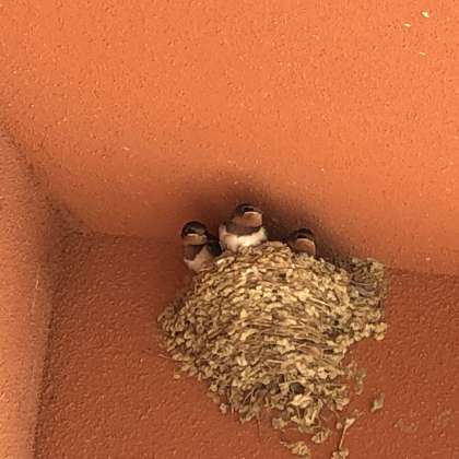 ツバメの巣が体育館入り口の天井にたくさんあります、年々増えているそうです。