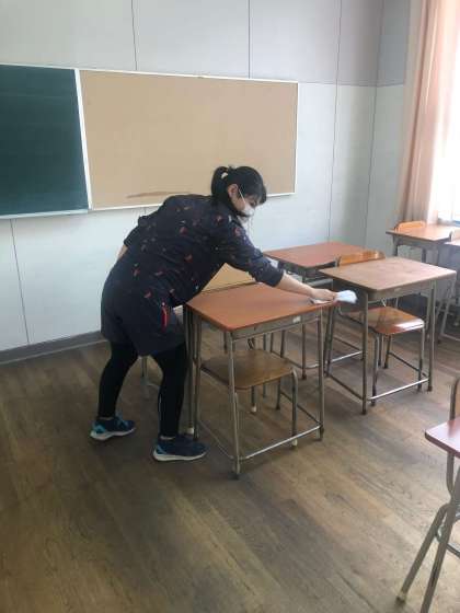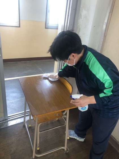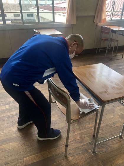 生徒が下校し、次のグループが来るまでに、先生方の手で教室等の消毒作業を行なっています。