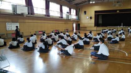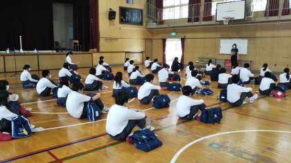 午前中の始業式に続き、午後の始業式・学級活動の様子。3クラスが体育館の2か所と格技室に分かれて十分な距離をとって(ソーシャルディスタンス)実施しています。ちょっと蒸し暑い中でしたが、生徒たちは真剣に取り組んでくれています。