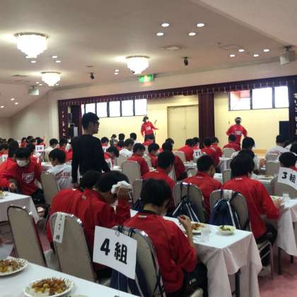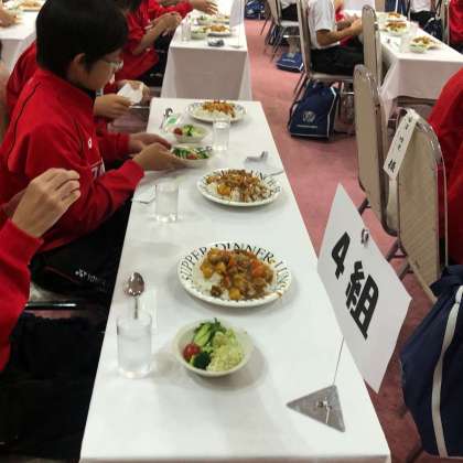 ラフティング会場から宿舎に戻り、冷えた身体を風呂とシャワーで温めて昼食です。