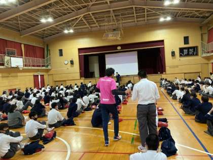 講師の先生は中学生のみんなと1番歳が近い理科の大海先生と、教育実習生の合羽先生です。2人の先生の中学生当時のお話から、高校や仕事の選択について実体験をもとにお話ししていただきました。