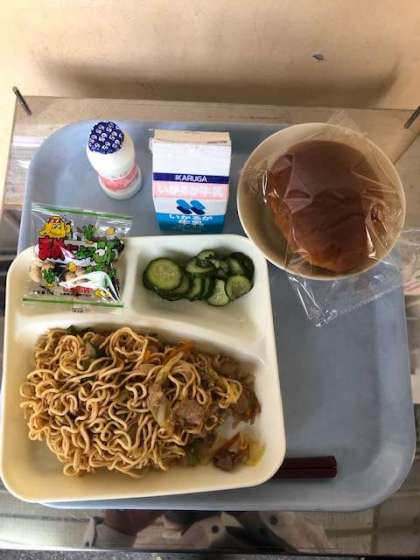 パン、牛乳 焼きそば、きゅうりのしょうがつけ 豆こんぶ、発酵乳