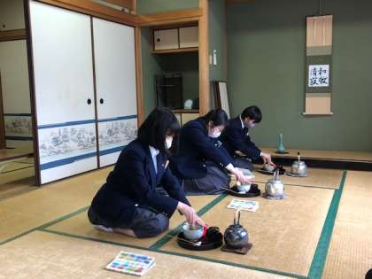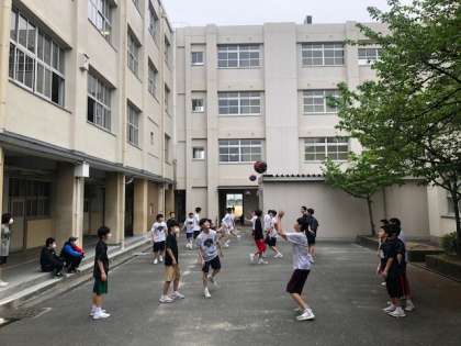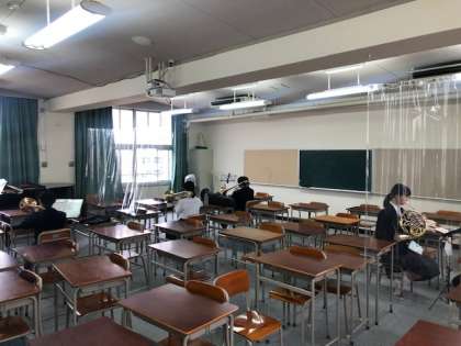 中庭では男子バスケットボールが元気にボールまわしをしています。茶道部はキリリと姿勢を正して所作を確認しています。吹奏楽部はパートに分かれて換気、パーテーションでさらに分けて取り組んでいます。頑張ってください。