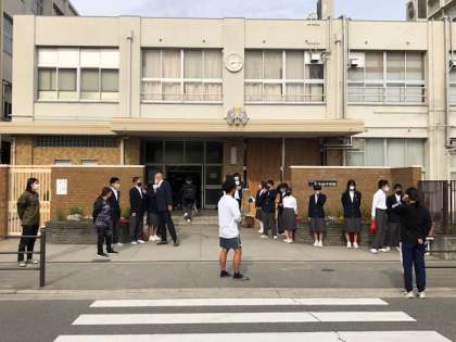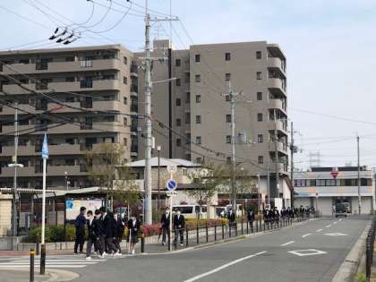 朝の登校のようすです。校区が広いので各ポイントで職員も登校指導を行っています。交通ルールを守って気をつけて登校しましょう。