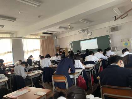 理科の授業で、プロジェクターが見やすいように教室を暗くして授業を行なっていました。しっかりと話を聞きながら板書を頑張っていました。