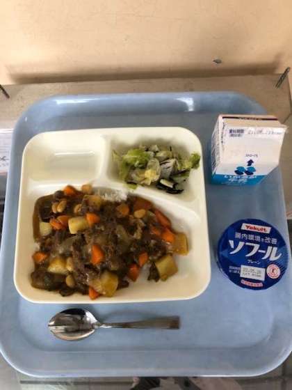 ごはん、牛乳 牛肉と大豆のカレーライス、キャベツのひじきドレッシング ヨーグルト